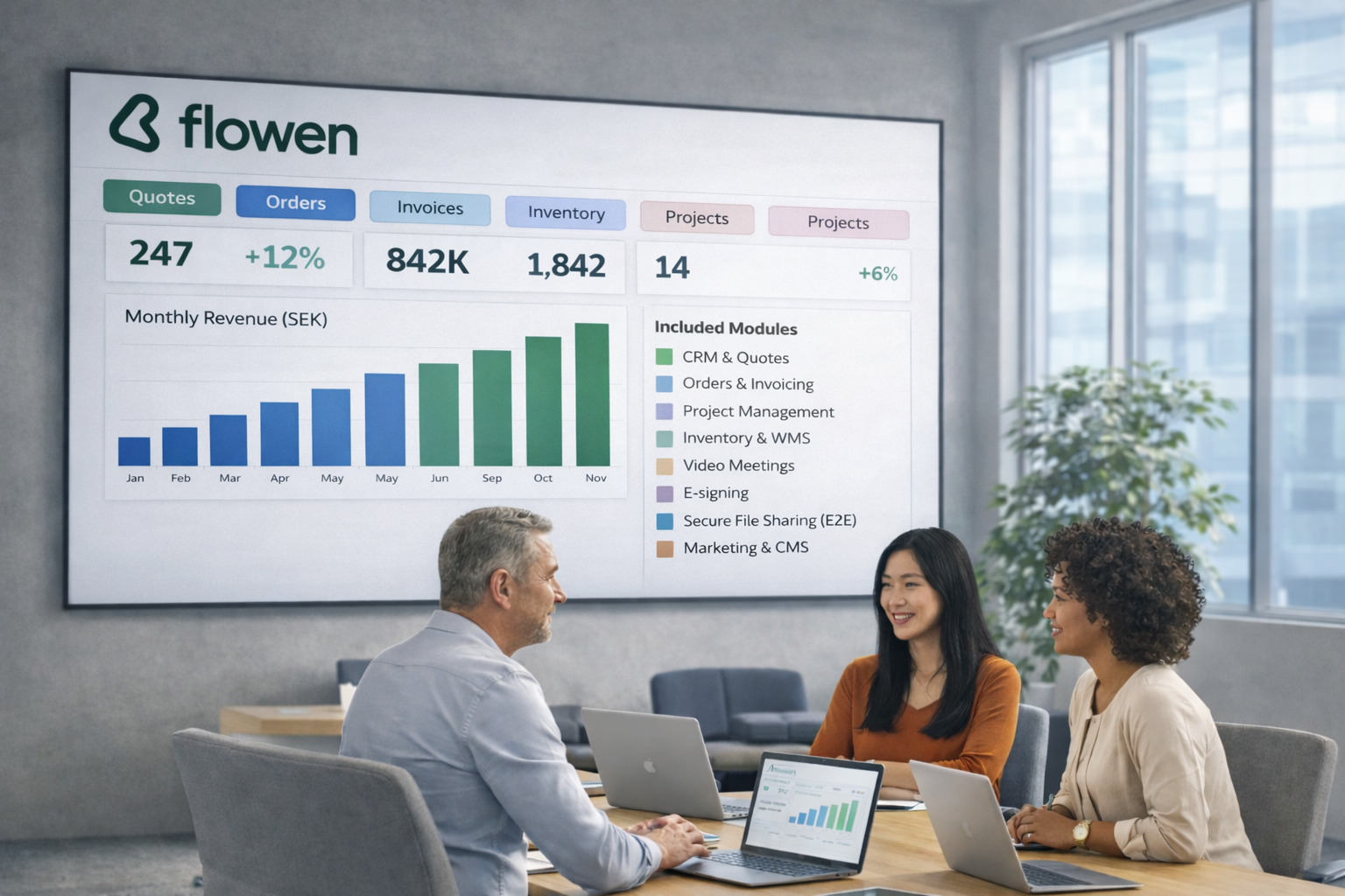 Flowen is a Swedish business platform that replaces up to 14 SaaS services. The platform is developed in Sweden, fully hosted within the EU, and built for companies that want to consolidate their operations in one system with full control over data and infrastructure.